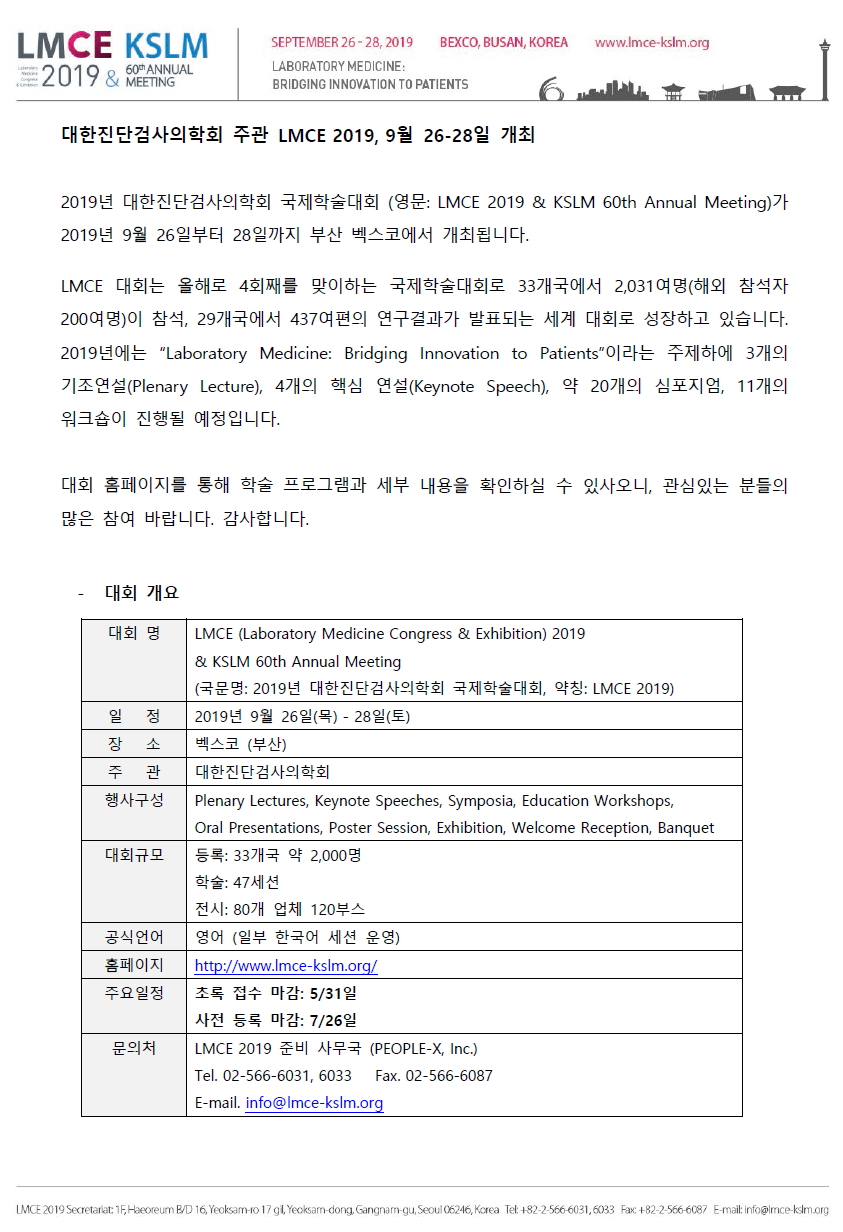[LMCE] 2019년 대한진단검사의학회 국제학술대회 개최 안내