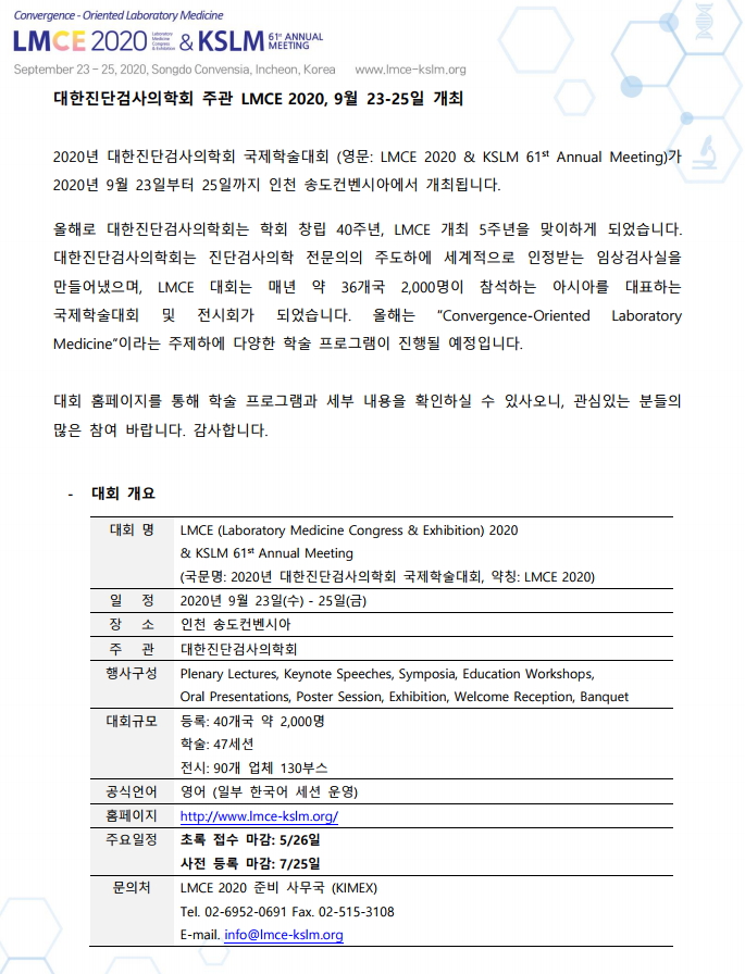 대한진단검사의학회 국제학술대회 (LMCE 2020) 개최 안내