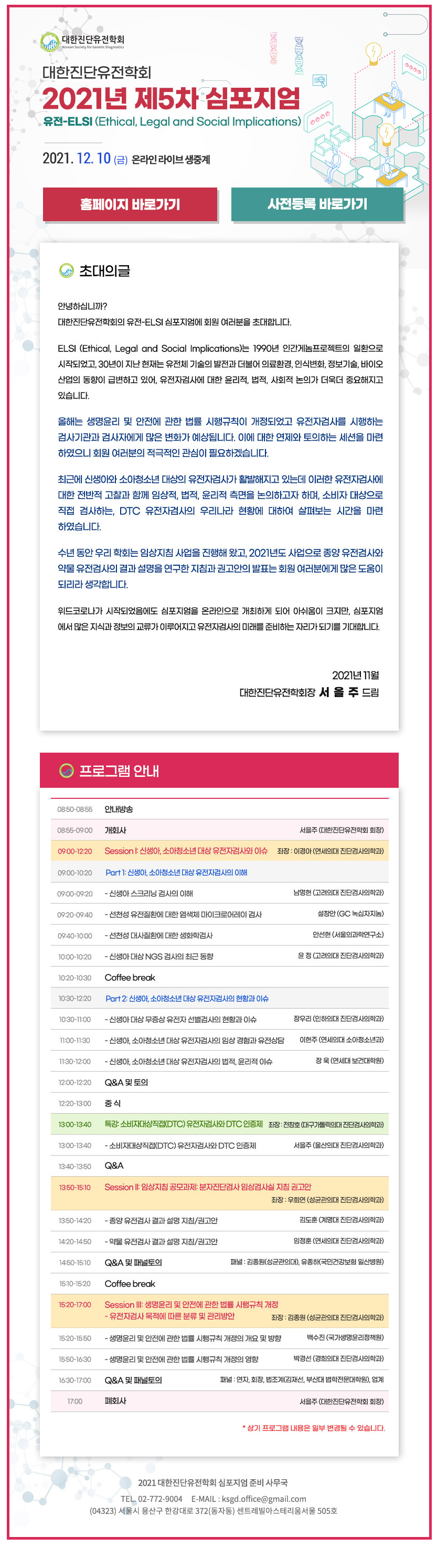 『대한진단유전학회 2021년도 제5차 심포지엄』이 아래 일자에 온라인 생중계로 진행됩니다.