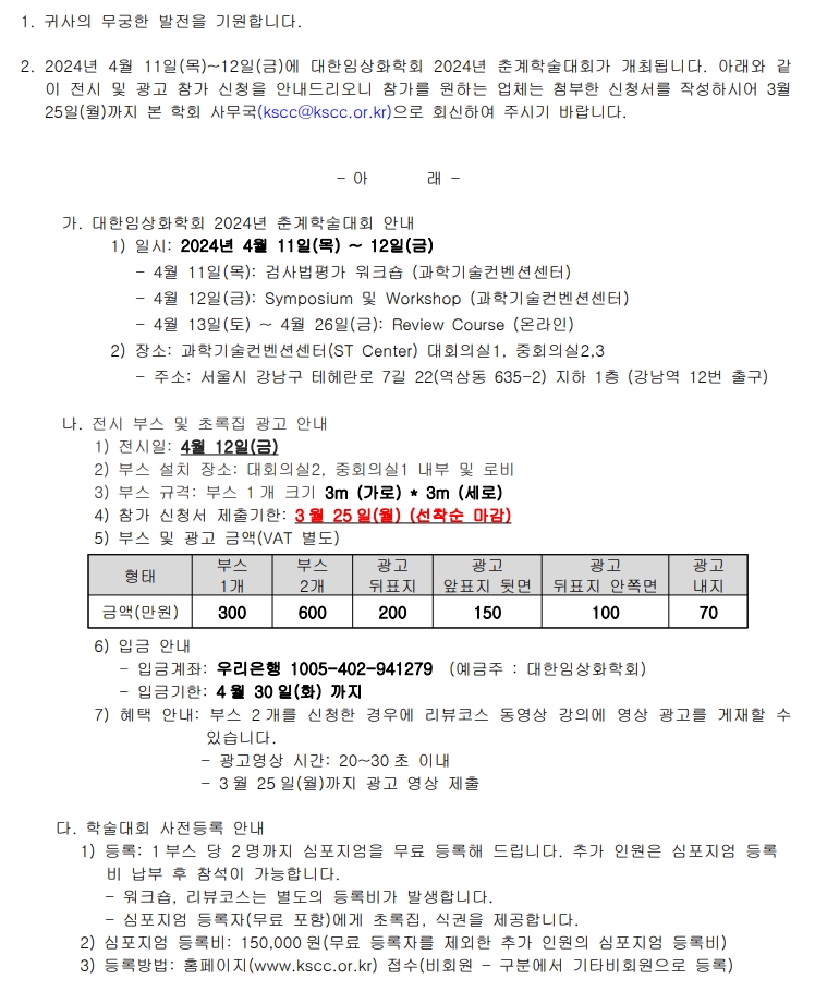 첨부1. 대한임상화학회 2024년 춘계학술대회 전시 및 광고 참가 신청 안내 공문 1부. 끝.