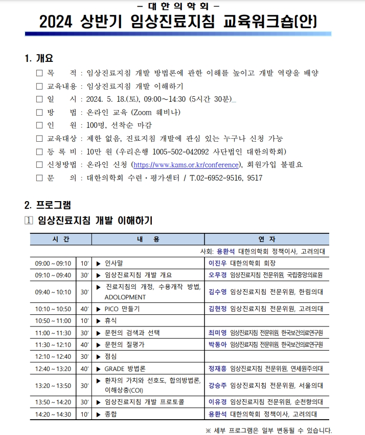[대한의학회] 2024 상반기 임상진료지침 교육워크숍(안)