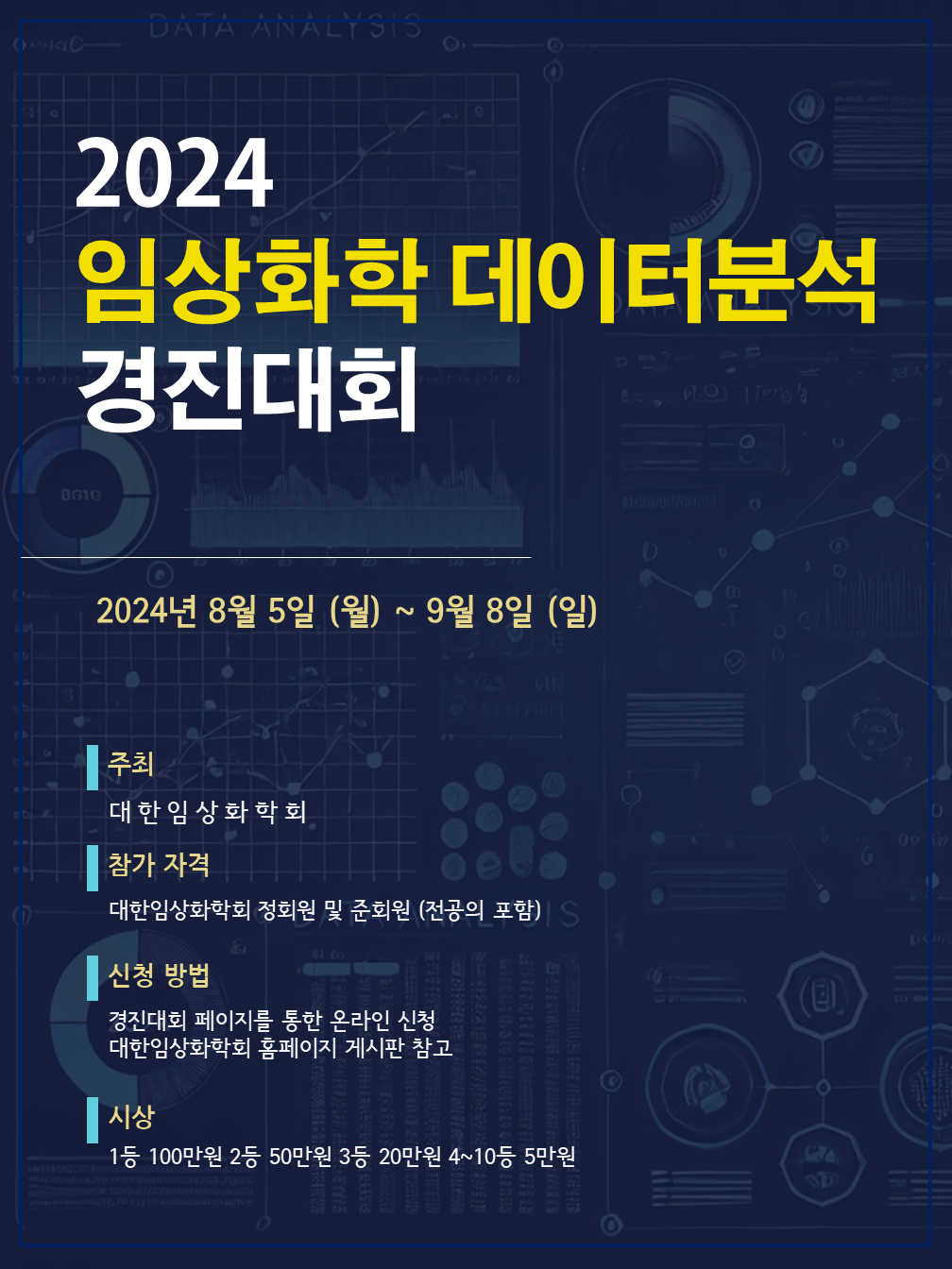 ※ 1등은 대한임상화학회 추계학술대회에서 데이터 분석 과정에 대해서 10분 내외 발표가 가능한 참가자에 한해 시상합니다. (발표 일정: 2024년 10월 17일(목), 13:30~15:00)