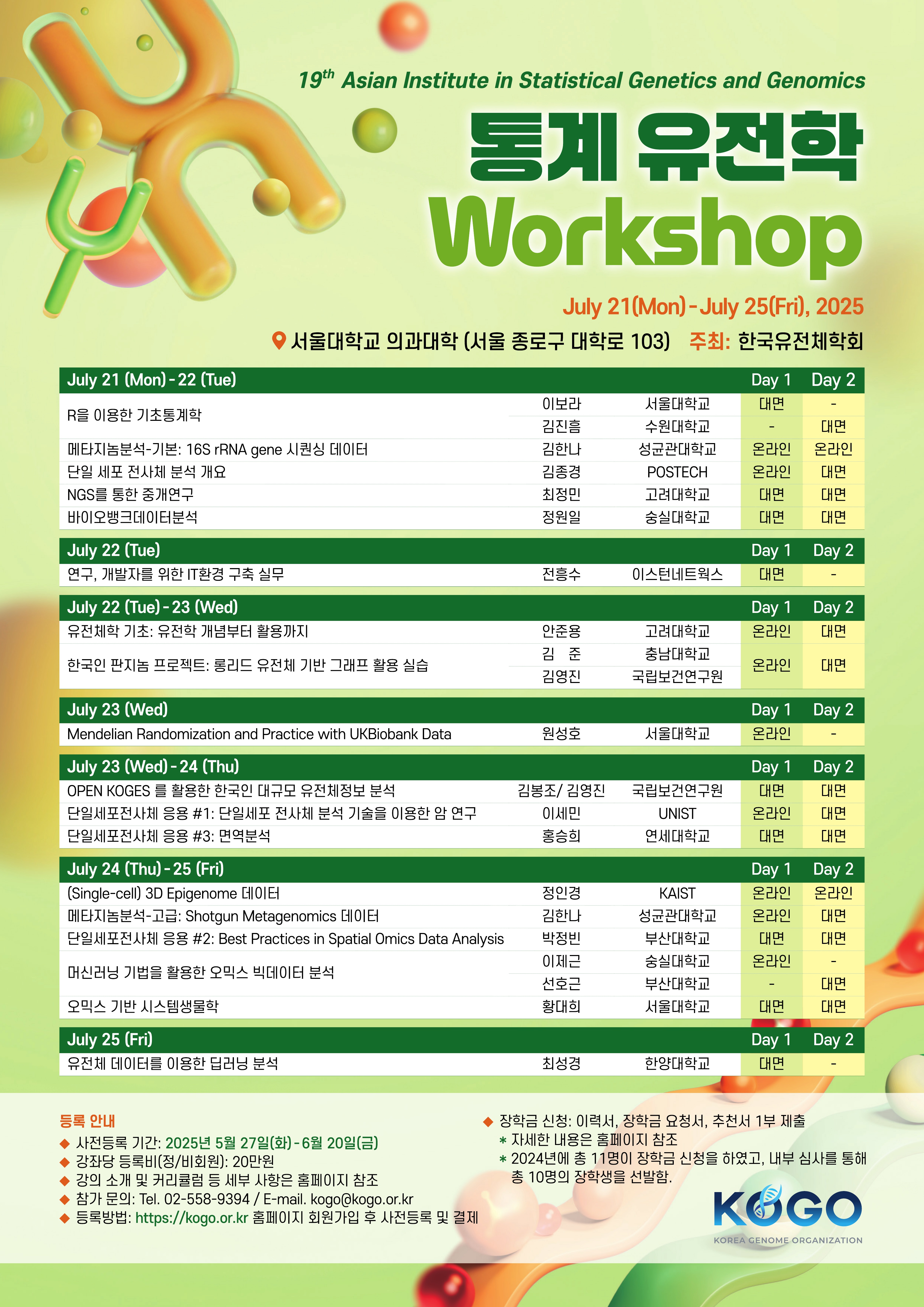 [한국유전체학회] 2025 제19회 통계유전학워크샵 안내