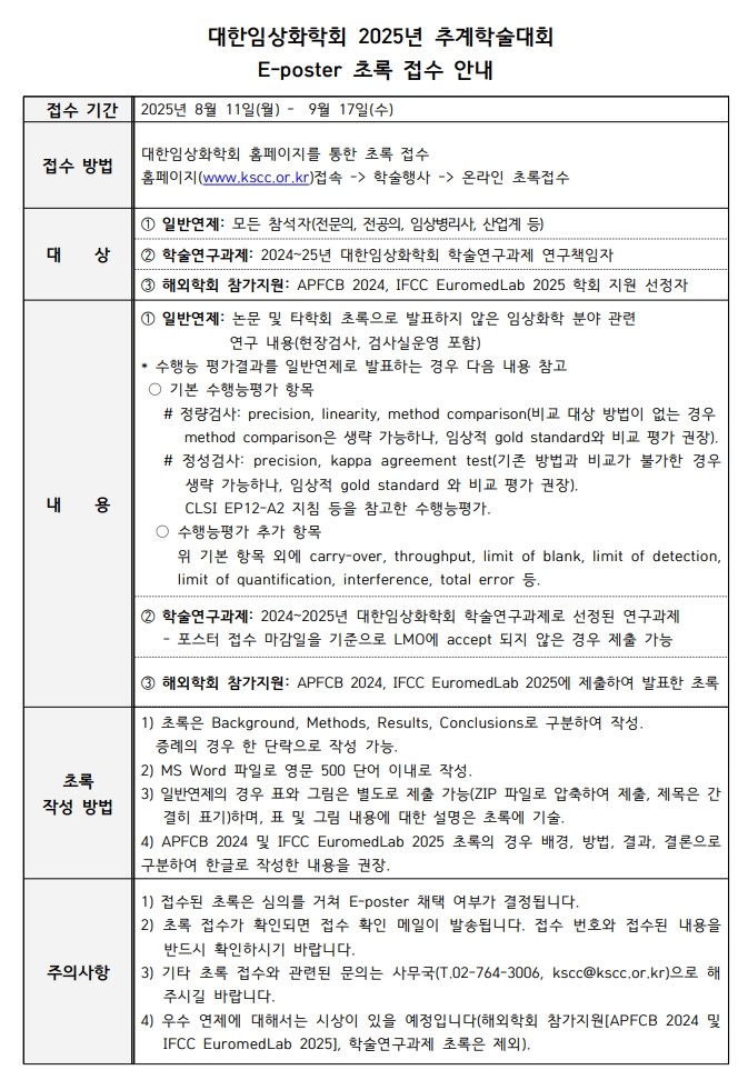 3. 이번 학술대회에는 E-poster 세션(10월 17일만 진행)이 있습니다. 아직 논문으로 발표되지 않은 임상화학에 대한 다양한 연구내용과 각 기관에서 평가한 수행능 자료, 대한임상화학회 학술연구과제의 내용 등이 일반연제로 접수 가능합니다. 자세한 사항을 다음과 같이 안내드리오니 회원 및 참석자 여러분의 많은 관심과 참여를 부탁드립니다.