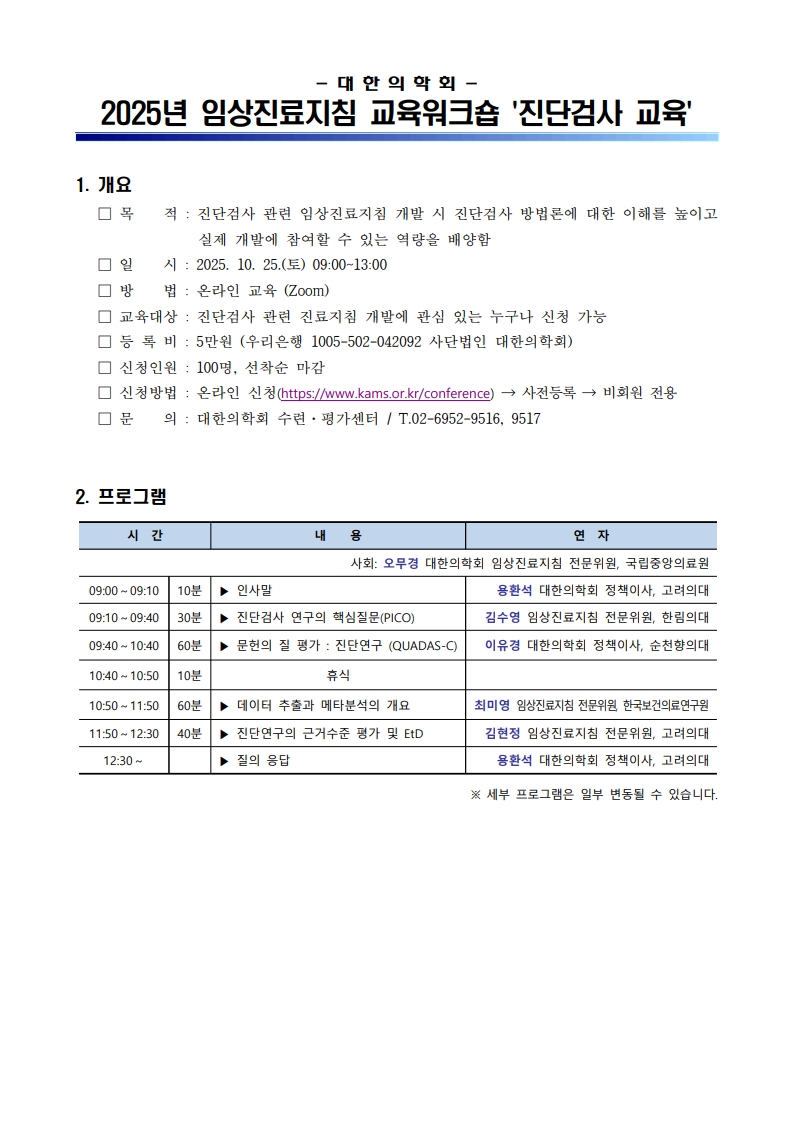 [대한의학회] 2025년 임상진료지침 교육워크숍 '진단검사 교육' 안내