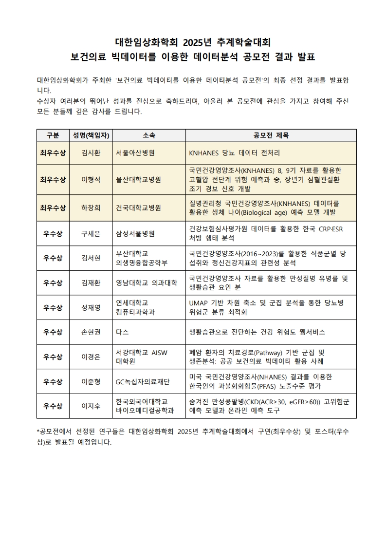 [대한임상화학회] 보건의료 빅데이터를 이용한 데이터분석 공모전 결과 발표