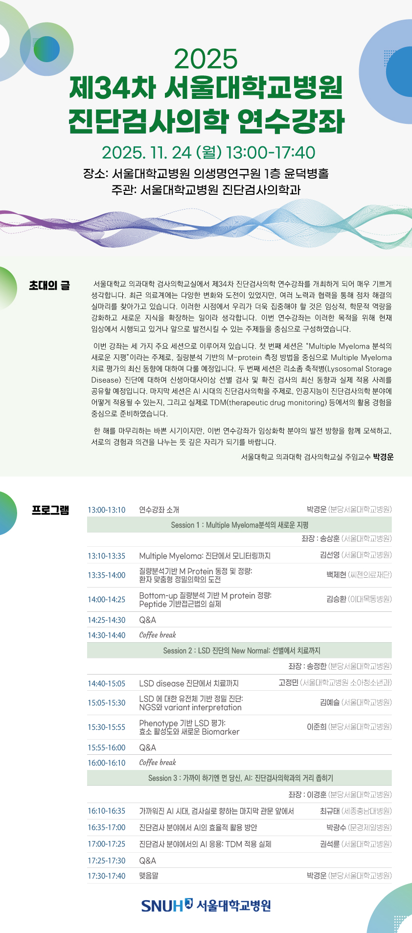 | (사전등록 기간 연장) [서울대학교병원] 제34차 2025년 서울대학교병원 진단검사의학 연수강좌 안내 | |||||
