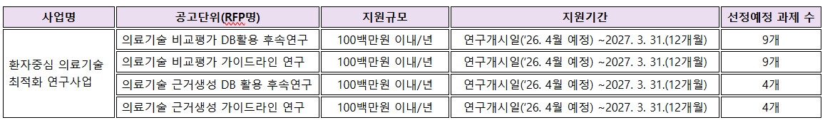 2026년도 환자중심 의료기술 최적화 연구사업 신규지원 대상과제 공고 안내 |