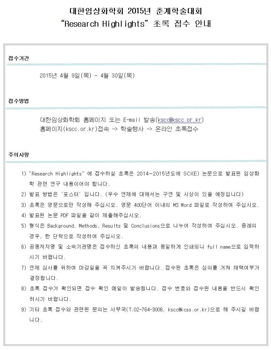 2015년 춘계학술대회 “Research Highlights” 초록 접수 안내