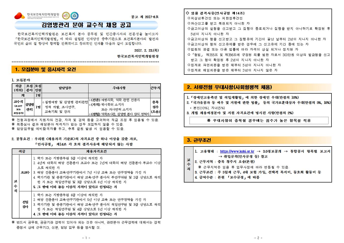 대임화 2017-21호 (연장공고)감염병 분야 교수직 채용 공고문.hwp